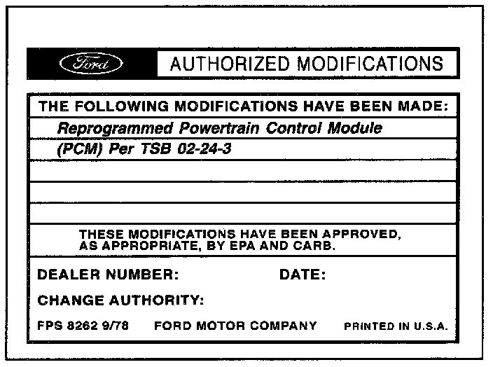 Obtain an Authorized Modifications Decal (FPS 8262 - obtainable through DOES II, 25/pkg) and list the date, dealer number, and summary of modifications performed. Select a prominent place adjacent to the Vehicle Emission Control Information Decal suitable for installing the Authorized Modifications Decal. Clean the area, install the decal and cover it with a clear plastic decal shield.