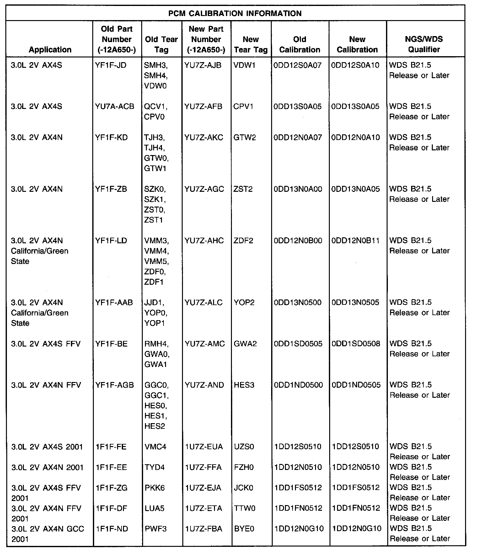 Some vehicles equipped with the 3.0L 2V or 3.0L FFV engine may exhibit spark knock during light accelerator tip in or heavy acceleration. 2001 2V and FFV Taurus/Sable vehicles may also exhibit a harsh Park to Drive engagement. This may be caused by the calibration of the Powertrain Control Module (PCM).