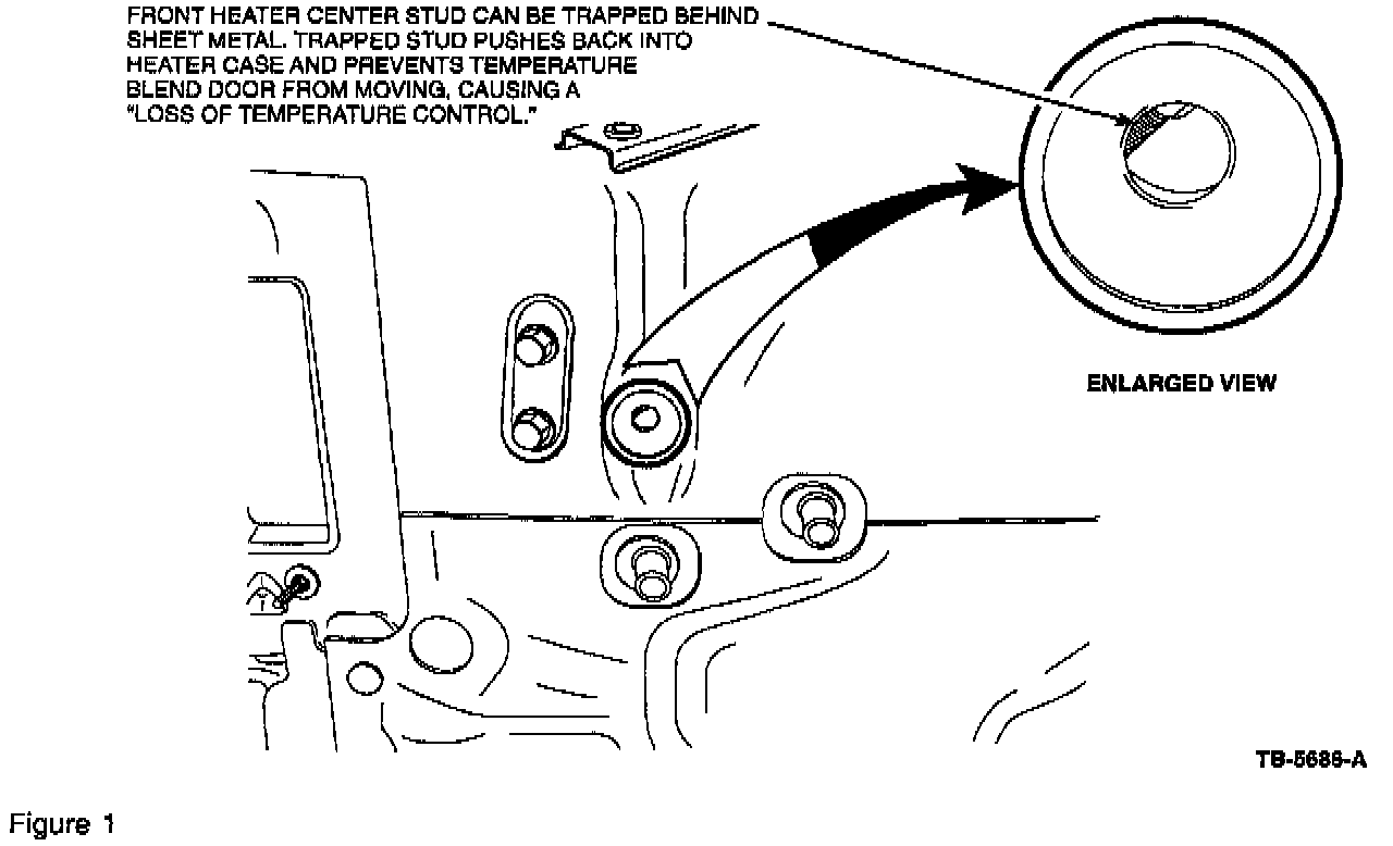 3. If the plenum retention center stud does not pass through the engine compartment bulkhead it will cause the plenum to deflect and obstruct the movement of the blend door. The blend door has to operate properly or temperature selection will be lost. To inspect the center stud position and verify that it passes through the bulkhead, look underhood near the A/C evaporator lines (Figure 1). The stud must have a nut and washer with sealer material under the washer.