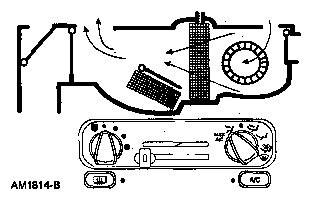 ^ Air will be picked up at the recirculation opening by the blower motor. With the temperature control set for maximum cold, airflow across the A/C evaporator core will be diverted past the heater core and then directed into the passenger compartment through the instrument panel A/C registers.