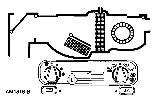^ The heater air damper door is in the no vacuum position, allowing no airflow to instrument panel A/C registers.