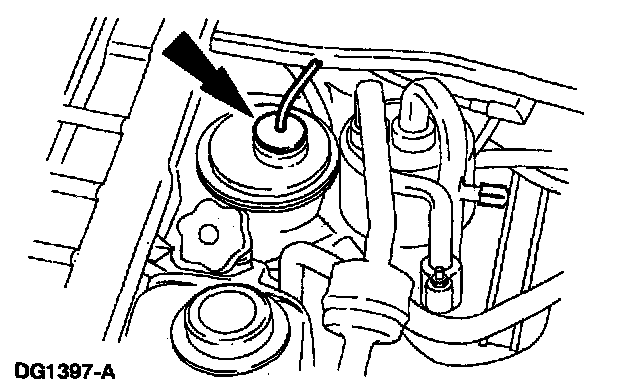Remove the reservoir cap. Check the fluid level. If necessary, fill the reservoir to the correct level.