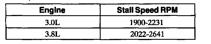If stall speeds were too high, refer to the chart. If stall speeds were too low, first check engine idle speed and tune-up. If engine is OK, remove torque converter and check torque converter clutch for slippage.