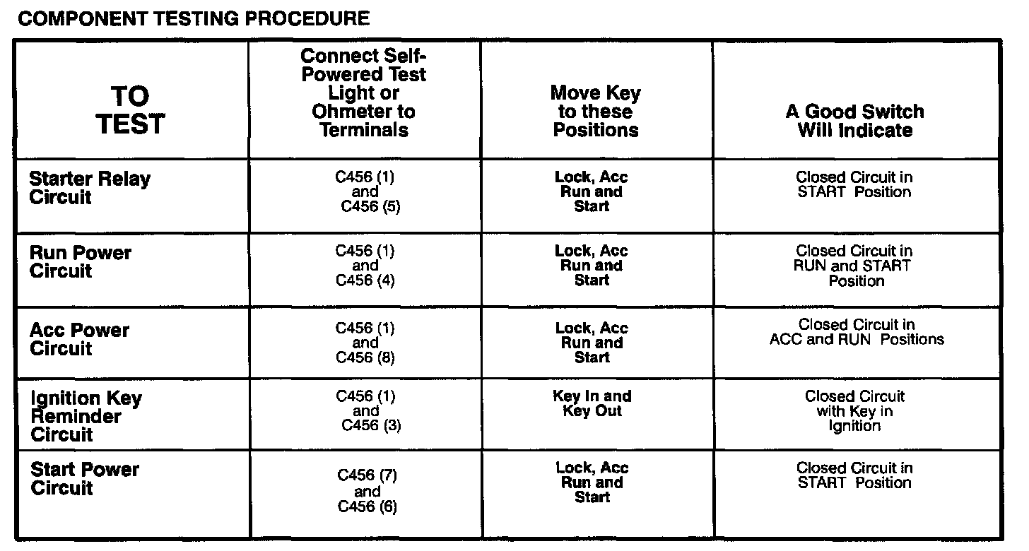 The component connector MUST BE REMOVED before testing. To test a single circuit within the component, select that circuit under the column TO TEST. If you wish to test the complete component, perform all tests.