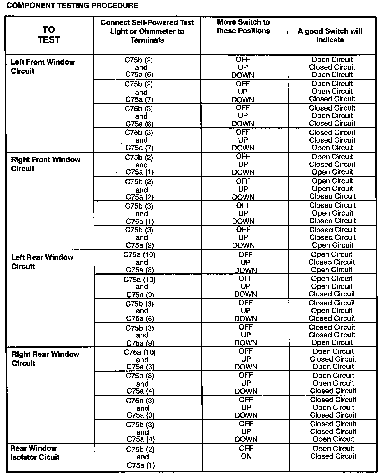 The component connector MUST BE REMOVED before testing. To test a single circuit within the component, select that circuit under the column TO TEST. If you wish to test the complete component, perform all tests.