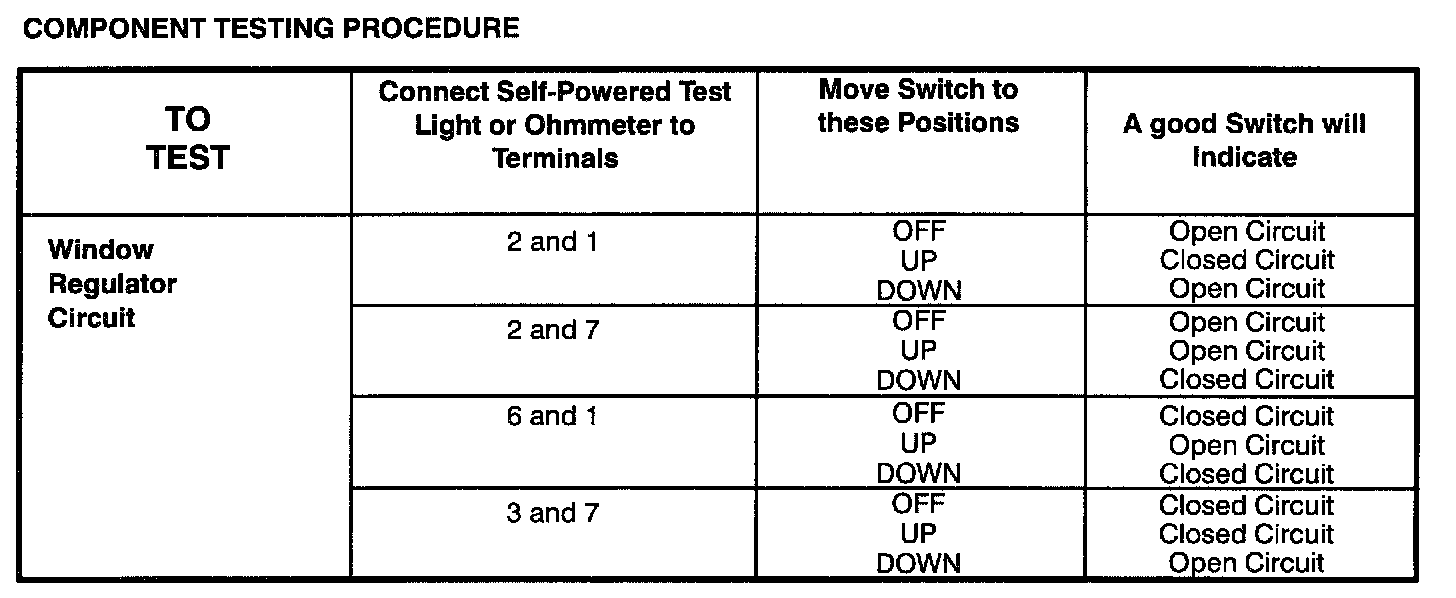 The component connector MUST BE REMOVED before testing. To test a single circuit within the component, select that circuit under the column TO TEST. If you wish to test the complete component, perform all tests.