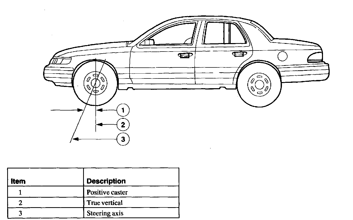 Caster is the deviation from vertical of an imaginary line drawn through the ball joints when viewed from the side. The caster specifications provided will give the vehicle the best directional stability characteristics when loaded and driven. The caster setting is not related to tire wear.