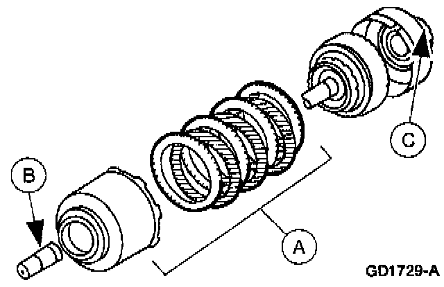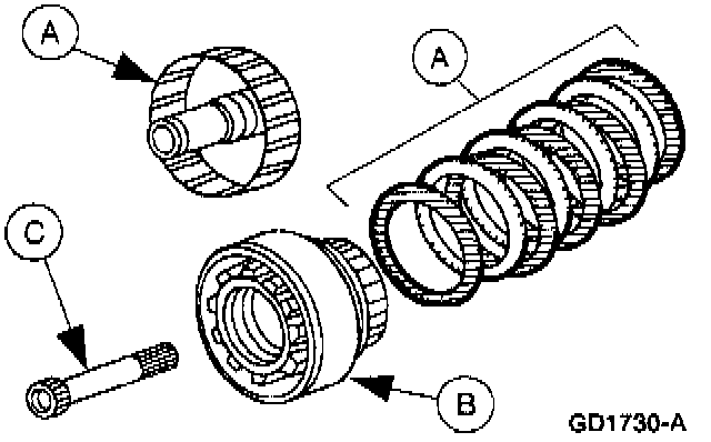 The (A) direct clutch couples the input shaft to the (B) planet carrier through the (C) stub shaft in third and fourth gears.