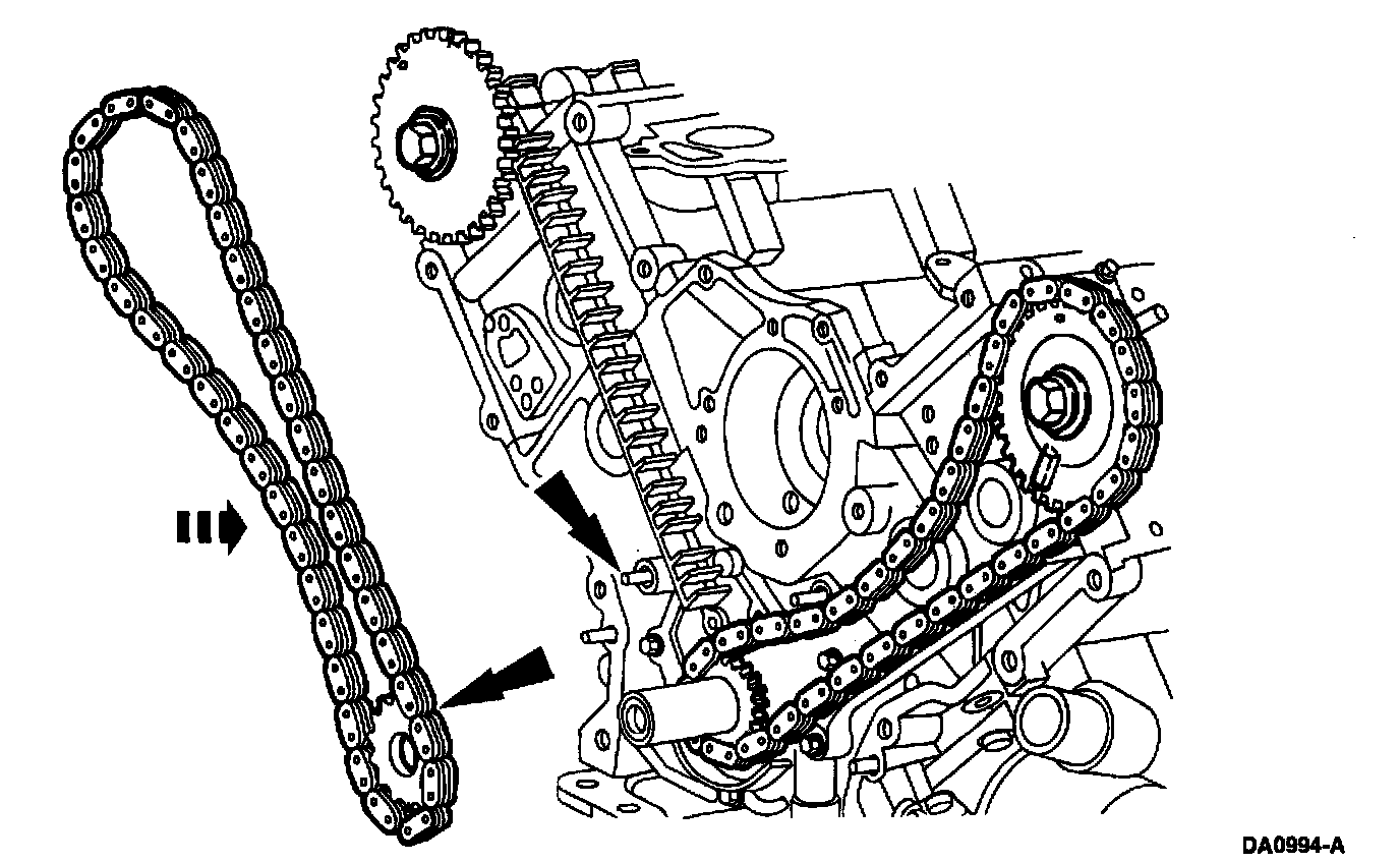 Install the timing chain on the camshaft sprocket with the two chain links and timing marks aligned.