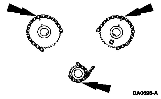 - Position the timing chain on the camshaft sprocket. Make sure the two copper-colored links align with the camshaft sprocket timing mark.