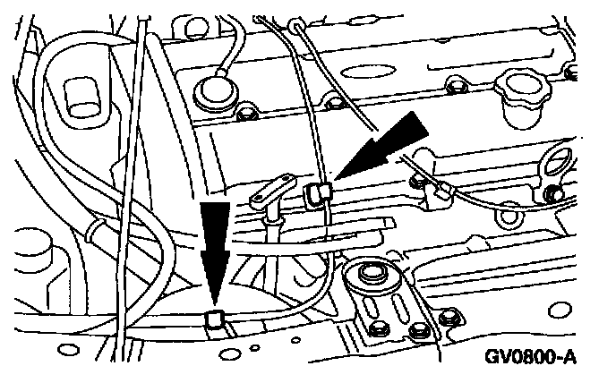 ^ Move the spring tab away from the speed control cable end to release the cable from the actuator. Remove the speed control actuator cable.