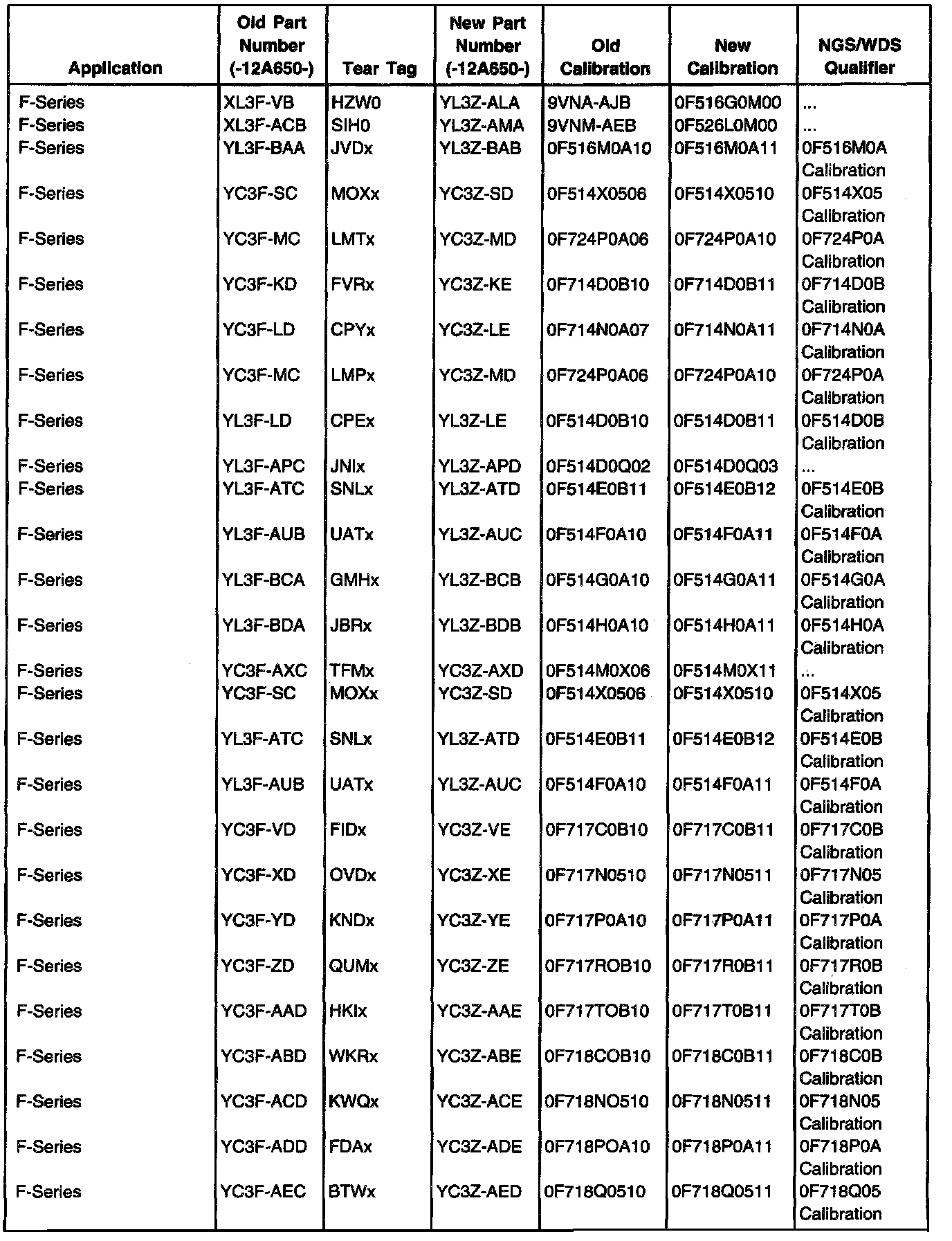 Perform normal diagnostics. If normal diagnostics cannot pinpoint the condition and no other concerns are found, reprogram the PCM using the Worldwide Diagnostic System (WDS) or New Generation Star (NGS) Tester. Refer to the PCM Calibration Information Chart as shown.