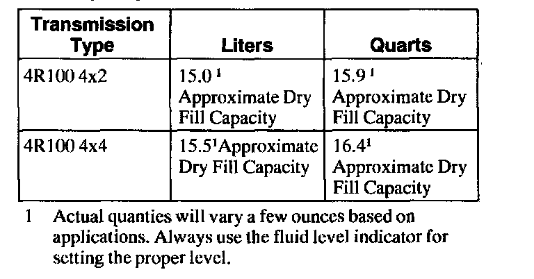 The above fluid capacities are approximate dry fill capacity and include fluid coolers and fluid cooler tubes. The fluid level indicator should be used to determine actual fluid requirement and fluid specifications. Check level at operating temperature. DO NOT OVERFILL.
