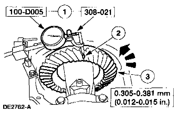 2 Position the indicator needle and zero the indicator. Turn the ring gear without turning the pinion gear and record the measurement.