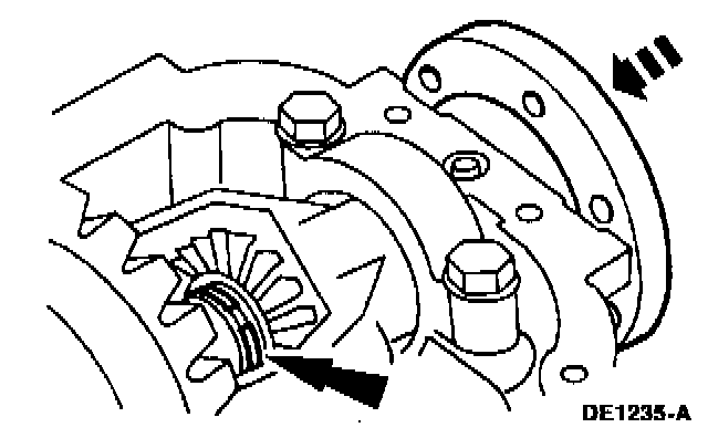 51. To decrease the backlash, install a thicker differential bearing shim and a thinner differential bearing shim as shown.