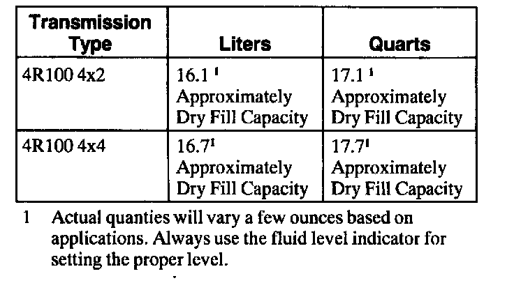 1 Actual quantifies will vary a few ounces based on applications. Always use the fluid level indicator for setting the proper level.