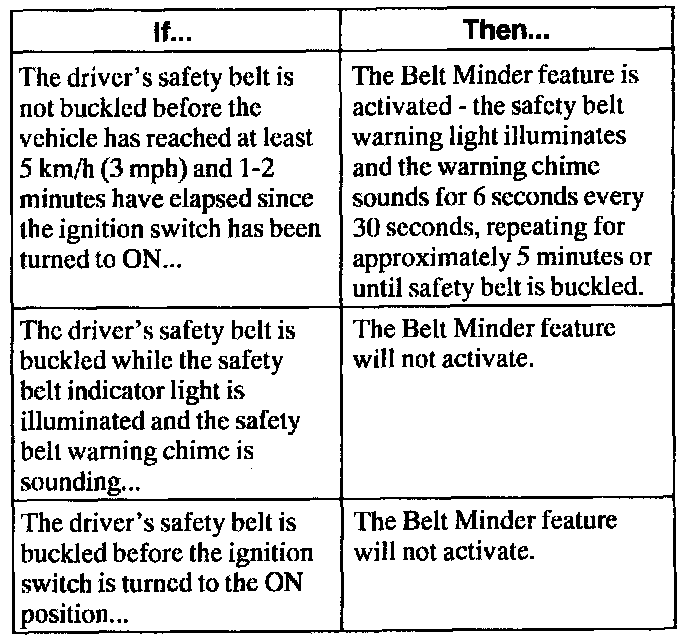 The Belt Minder feature is a supplemental warning to the safety belt warning function. This feature provides additional reminders to the driver that the driver's safety belt is unbuckled by intermittently sounding a chime and illuminating the safety belt warning lamp in the instrument cluster.