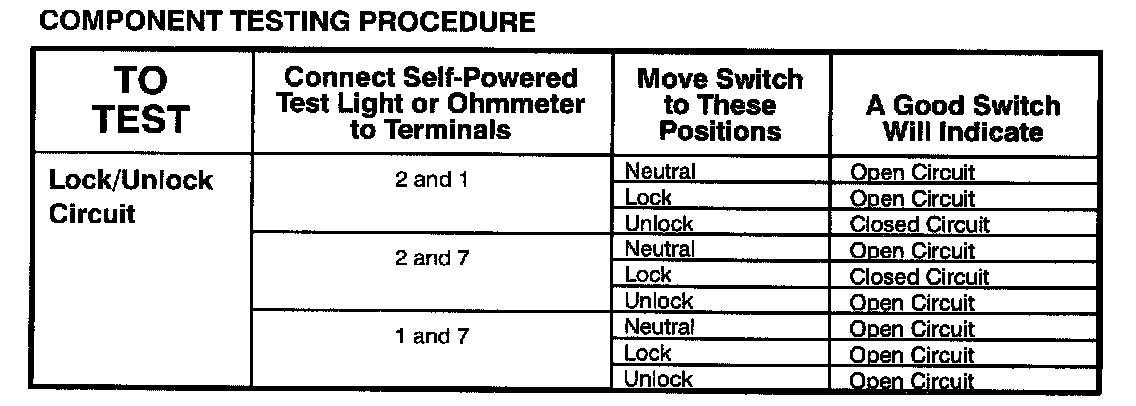 The component connector MUST BE REMOVED before testing. To test a single circuit within the component, select that circuit under the column TO TEST If you wish to test the complete component, perform all tests.