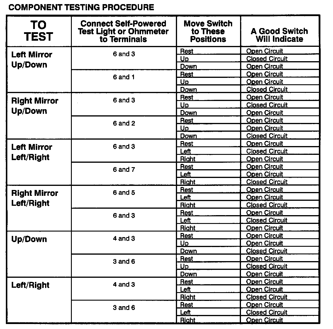 The component connector MUST BE REMOVED before testing. To test a single circuit within the component, select that circuit under the column TO TEST If you wish to test the complete component, perform all tests.