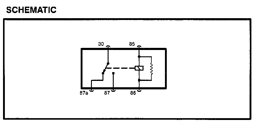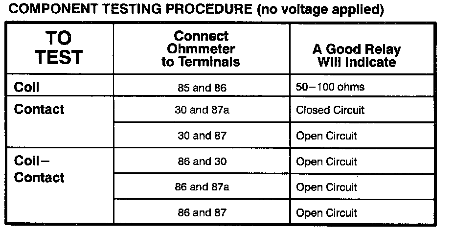 Disconnect the ohmmeter; connect pins 30 and 85 to 12 V DC power and pin 86 to ground. Measure voltage between pin 87 and pin 86. If the voltage is 12 V continue with the test. If not, replace the relay. Disconnect power from pin 85 and measure voltage between pin 87a and pin 86. If the voltage is 12 V, the relay is okay. If not, replace the relay.