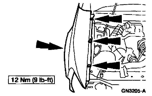 7. Remove the grille opening panel to fender bolts.