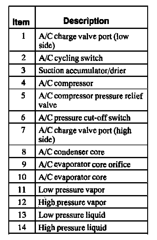 The A/C cycling switch interrupts compressor operation before the external temperature of the A/C evaporator core gets low enough to cause the condensed water vapor (excess humidity) to turn to ice. It does this by monitoring low side line pressure. It is known that a refrigerant pressure of approximately 210 kPa (30 psi) will yield an operating temperature of 0° C (32° F). The A/C cycling switch controls system operation in an effort to maintain this temperature. The high side line pressure is also monitored so that the A/C compressor operation can be interrupted if system pressure becomes too high.