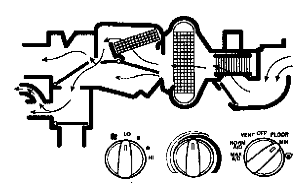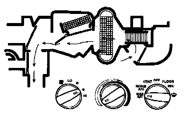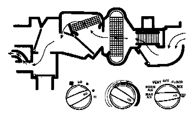 - air will be picked up at the recirculation opening by the blower motor. Airflow across the A/C evaporator core will be diverted past the heater core and then directed into the passenger compartment through the instrument panel A/C registers.
