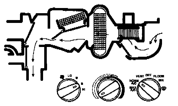 - the heater air damper door is in the partial vacuum position, allowing airflow to both heater outlet floor ducts and windshield defroster hose nozzles.