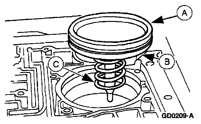 21. Remove the (A) reverse band servo cover, (B) reverse band servo piston and rod and (C) reverse band servo spring.