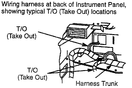 for take out, used in the Location Index (Cell 152), refers to the point at which a group of wires branch off the harness trunk. Refer to the wiring harness illustration.