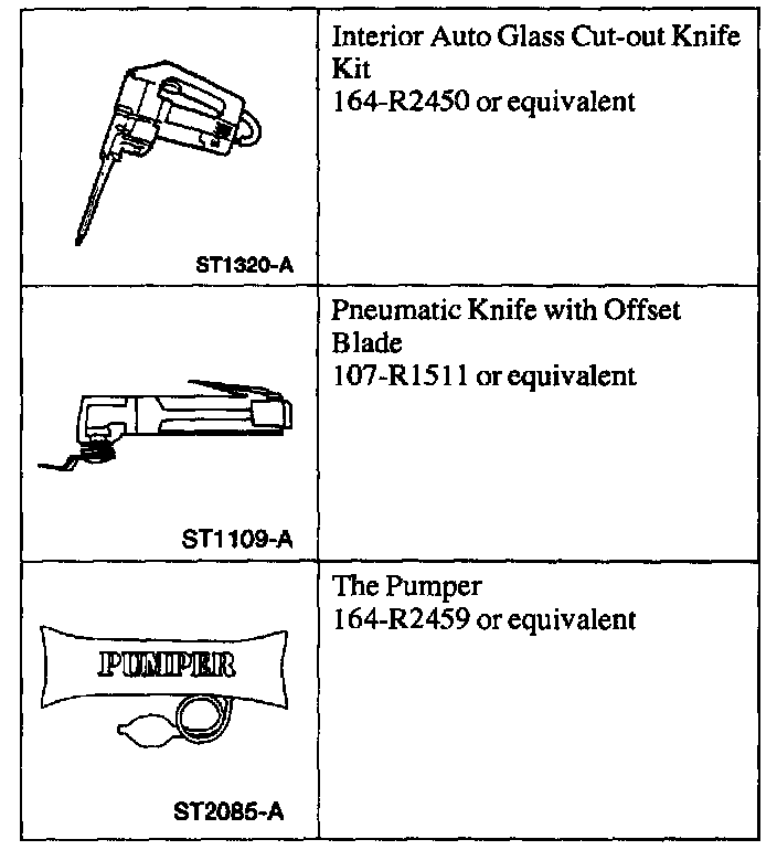WARNING: TO PREVENT GLASS SPLINTERS FROM ENTERING EYES OR CUTTING HANDS, WEAR SAFETY GLASSES AND HEAVY GLOVES WHEN CUTTING GLASS FROM THE VEHICLE.