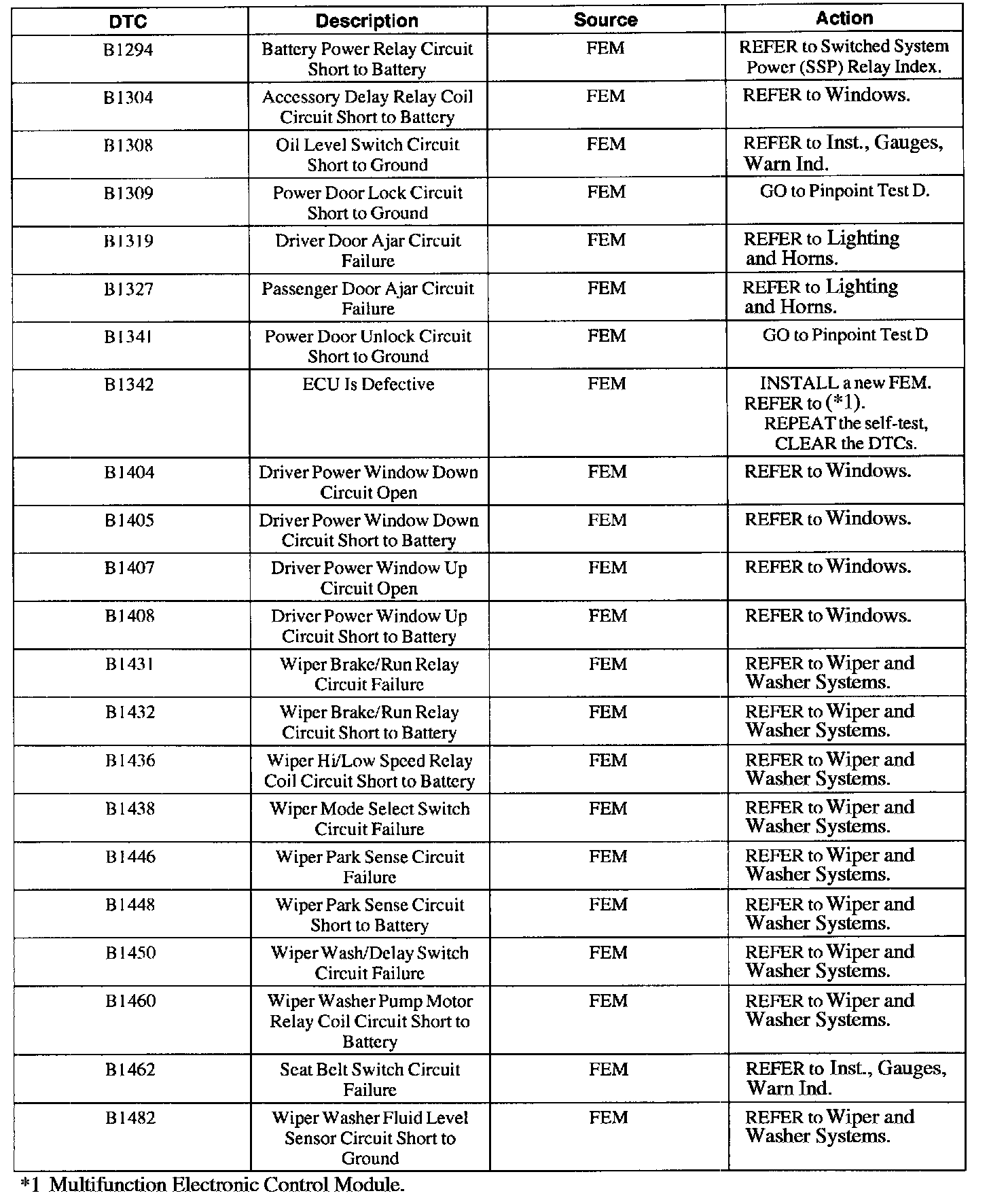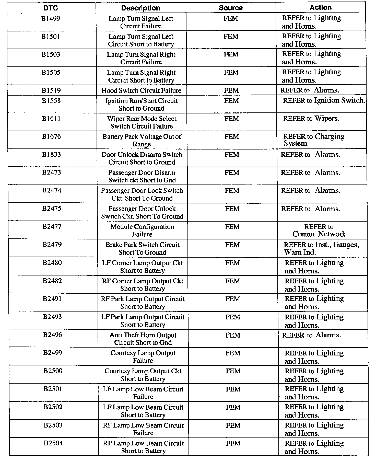 FEM Diagnostic Trouble Code (DTC) Index