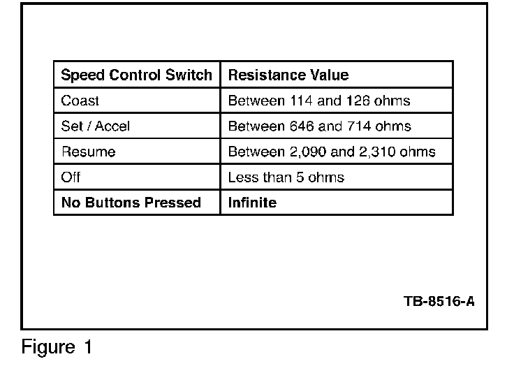 An alternate to the voltage drop test would be to disconnect the switch connector and measure the switch resistance. It should be less than 5 ohms. If the switch is suspected, a bypass test may also be done: On the harness side of the BPS connector, connect a jumper between the two deactivation switch pins and drive vehicle above 30 MPH (48 Km/h). If speed control engages then the brake deactivation switch was faulty, otherwise wiring is at fault.