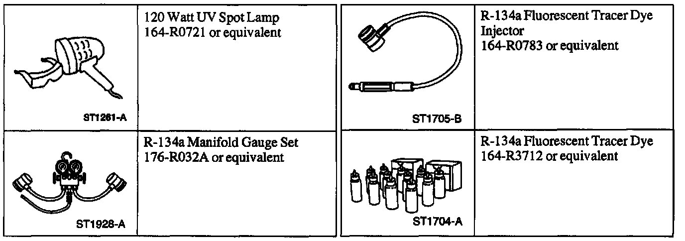 NOTE: Ford Motor Company vehicles are produced with R-134a Leak Tracer Dye incorporated into the A/C system. The fluorescent life span of the leak tracer dye is 500 hours of A/C system use, after which another injection of dye is required. The location of leaks can be pinpointed by the bright yellow-green glow of the tracer dye. Since more than one leak can exist, always inspect each component.