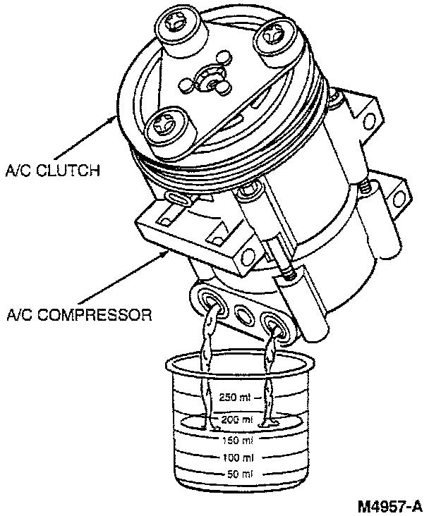 CAUTION: During normal A/C operation, oil is circulated through the system with the refrigerant, and a small amount is retained in each component. If certain components of the system are removed for new installation, some of the refrigerant oil will go with the component. To maintain the original total oil charge, it is necessary to compensate for the oil lost by adding oil to the system with the new part.1. Rotate the A/C compressor shaft six to eight revolutions while collecting oil in a clean measuring device.