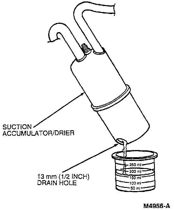 2. For the suction accumulator/drier, drill two 13 mm (0.52 in) holes in the suction accumulator/drier cylinder and drain the oil into a calibrated container.