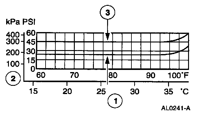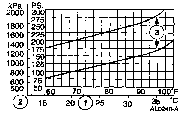 NOTE: In ambient temperatures between 38-43°C (100-110°F), the system performance pressures will be the same as those for ambient temperatures shown on the chart in the 32-38°C (90-100°F) range.
