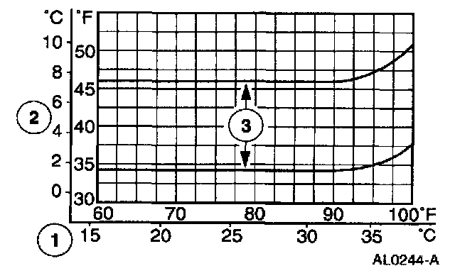 3 The system performance is acceptable when the center A/C register discharge temperature falls between the upper and lower limits shown.