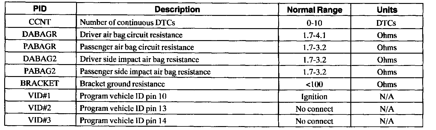The PID/Data Monitor and Record option allows the scan tool operator to read the state of several Parameter IDs (PIDs) to aid in diagnosing the system. PIDs are real time measurements of parameters such as voltages, resistances, etc., calculated by the Restraints Control Module (RCM) and sent to the scan tool for display. Many of the PIDs supported by the RCM are calculated periodically and are, therefore, not true real time readings . The following is a table of supported PIDs expected range and units of measurement.