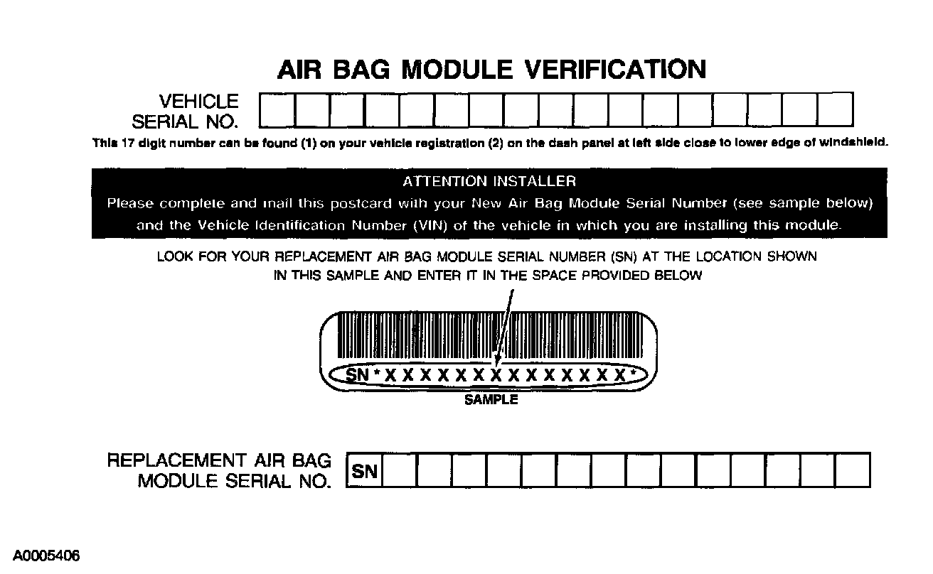 NOTE: When installing a new air bag module, a prepaid return postcard is provided with the replacement air bag module. The serial number for the new part and the Vehicle Identification Number (VIN) must be recorded and sent to Ford Motor Company.