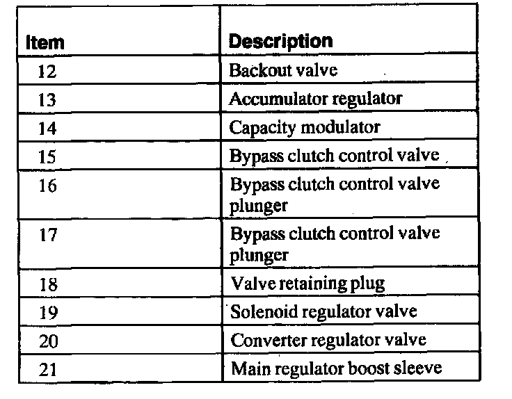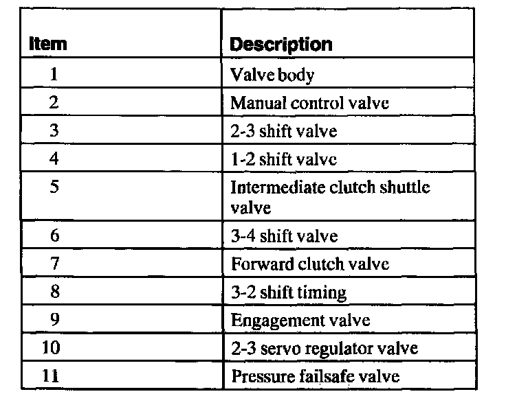 6. CAUTION: Most valves are aluminum and cannot be removed using a magnet. Remove the valves by tapping the valve body on the palm of the hand to slide the valves out of the bores. It may be necessary to remove the valves and springs using a pick. If it is necessary to use a pick, use extreme caution to prevent damaging the valves or valve bores. If necessary, disassemble parts of the main control valve body in small groups. Take special care when handling the main control components, since they are the most precise and delicate parts of the transaxle. Neatly arrange the parts as they are removed to avoid mixing similar pieces.