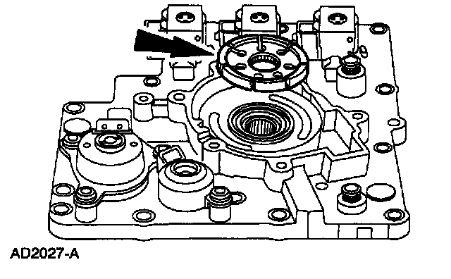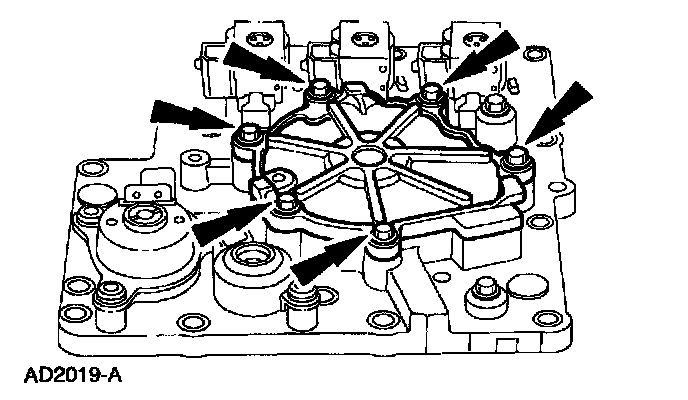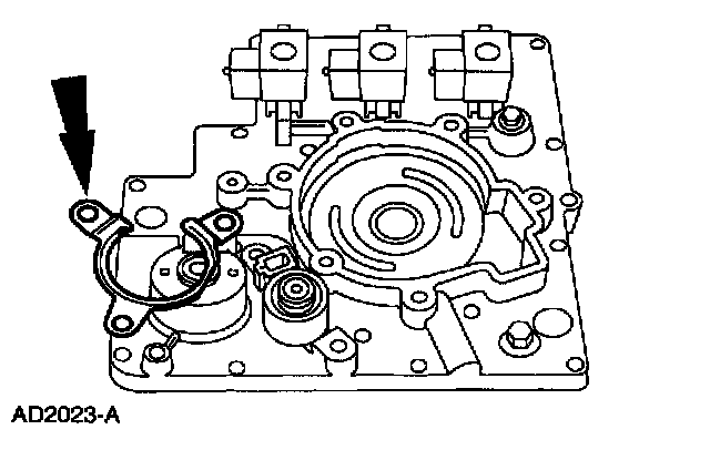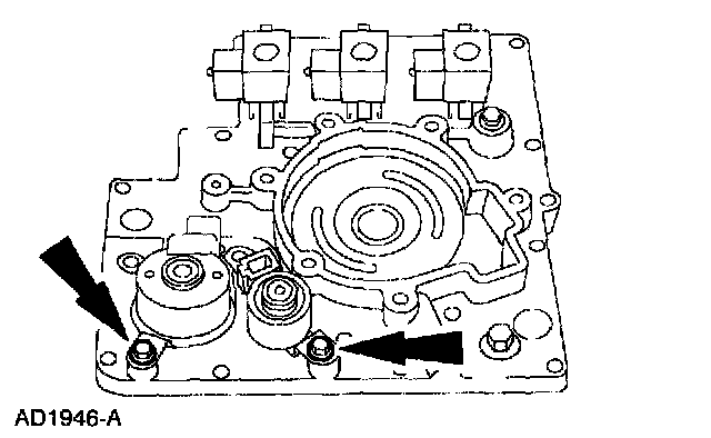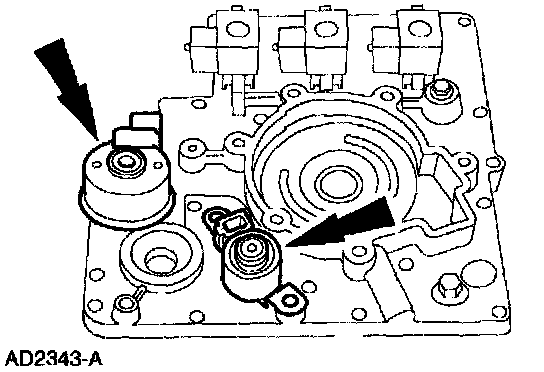 Remove the shift solenoids by pressing locking tab with a screwdriver and rotating them.