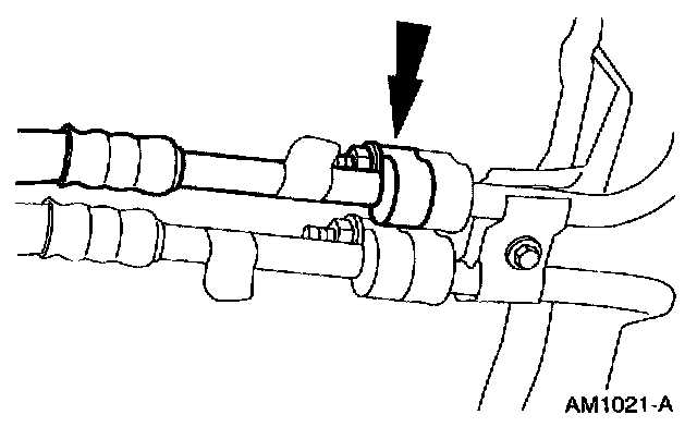 4. Disconnect the condenser to evaporator tube from the A/C condenser core. Refer to peanut fitting connect and disconnect procedure.