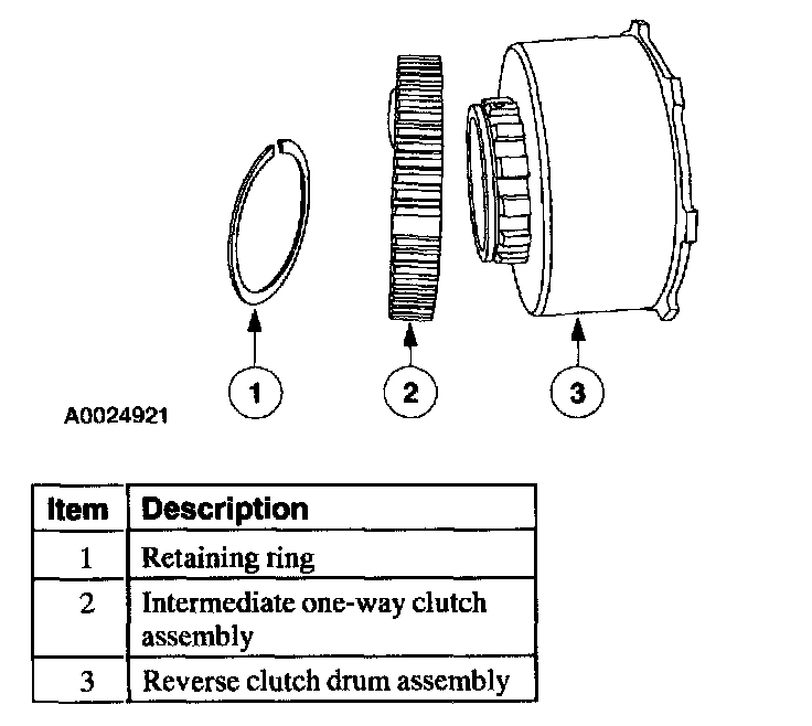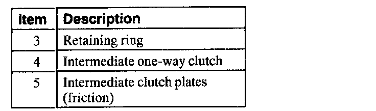 The intermediate one-way clutch works with the intermediate friction clutch to hold the reverse clutch drum and reverse sun gear stationary in second gear during acceleration. The intermediate one-way clutch freewheels in third gear and during coasting in second gear, (D) and D ranges.