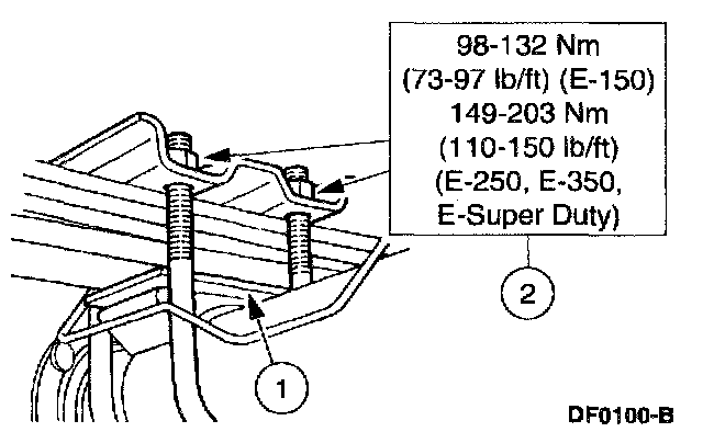 2. Loosen the four rear spring U-bolt nuts to allow the rear axle to separate from the rear spring.