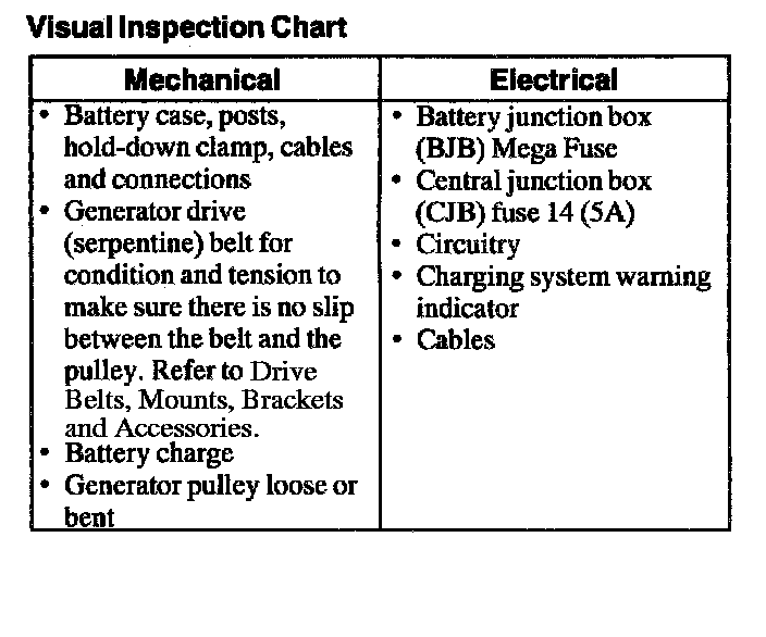 2. Inspect the charging system to determine if any obvious mechanical or electrical concerns exist. If found, repair as necessary and test the system for normal operation. Refer to the tables.