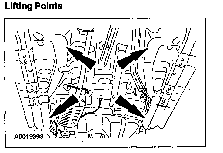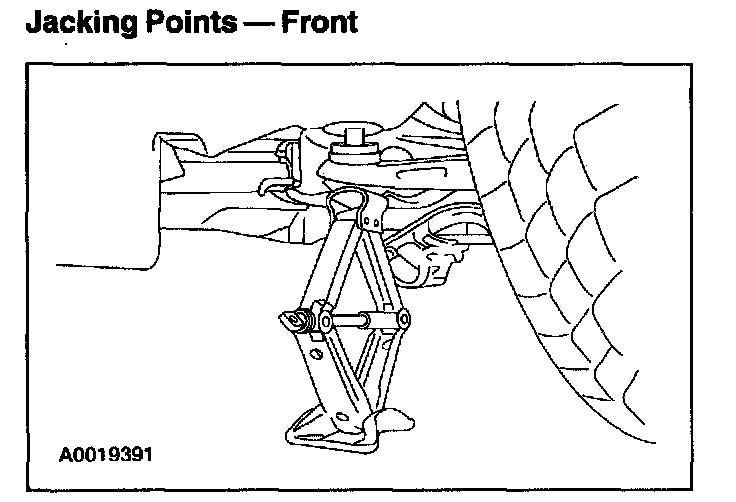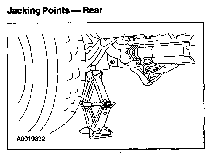 CAUTION: The service jack provided with the vehicle is only intended to be used in an emergency for changing a deflated tire. Never use the service jack to hoist the vehicle for any other service. Refer to the Owner Guide when using the jack supplied with the vehicle.
