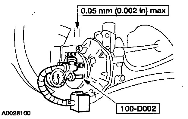2. Rotate the hub one full turn and note the maximum and minimum readings. The difference between the maximum and minimum readings will be the total face runout. The runout must not exceed 0.254 mm (0.010 inch).