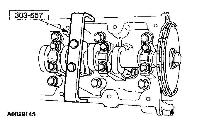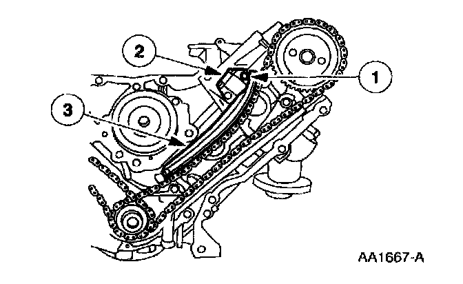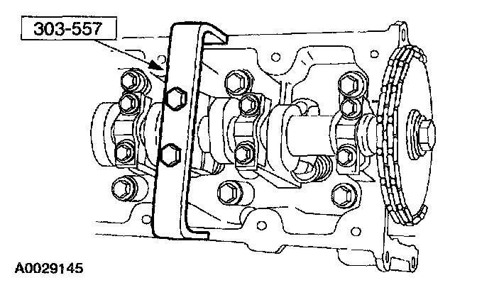 3. CAUTION: Unless otherwise instructed, at no time when the timing chains are removed and the cylinder heads are installed is the crankshaft or camshaft to be rotated. Severe piston and valve damage will occur.