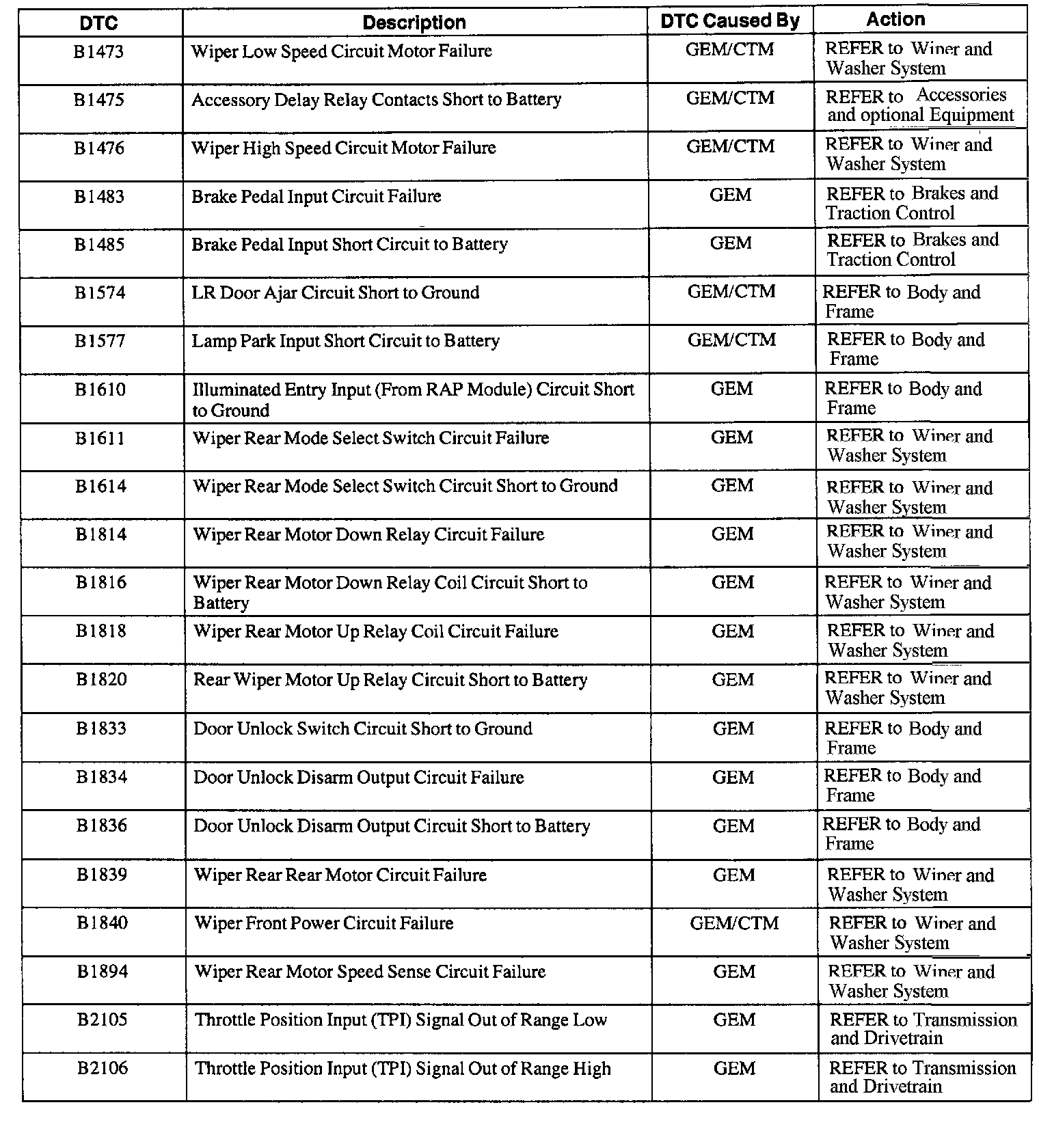 GEM/CTM Diagnostic Trouble Code (DTC) Index